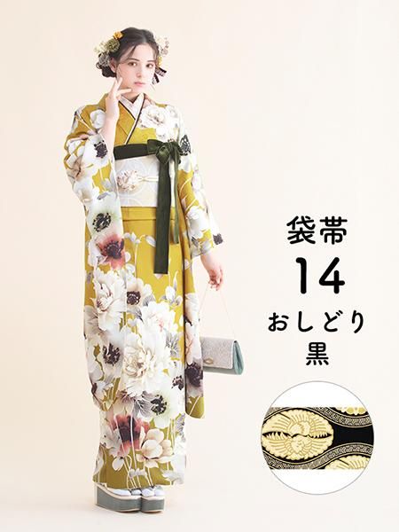正絹振袖レンタルセット オールドフラワー(カラシ)/帯 おしどり(黒)