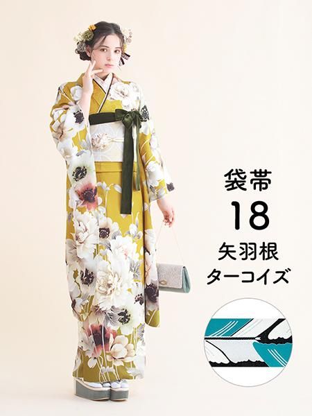 正絹振袖レンタルセット オールドフラワー(カラシ)/帯 亀甲(オフ)