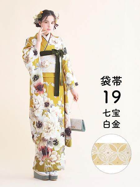 正絹振袖レンタルセット オールドフラワー(カラシ)/帯 七宝(白金)