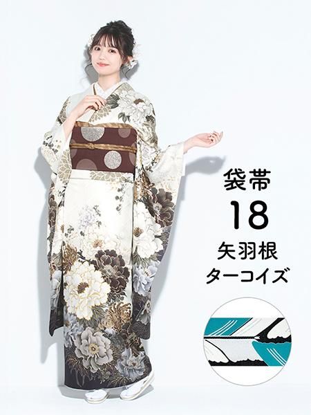 正絹振袖レンタルセット 白クジャク(白)/帯 矢羽根(ターコイズ)