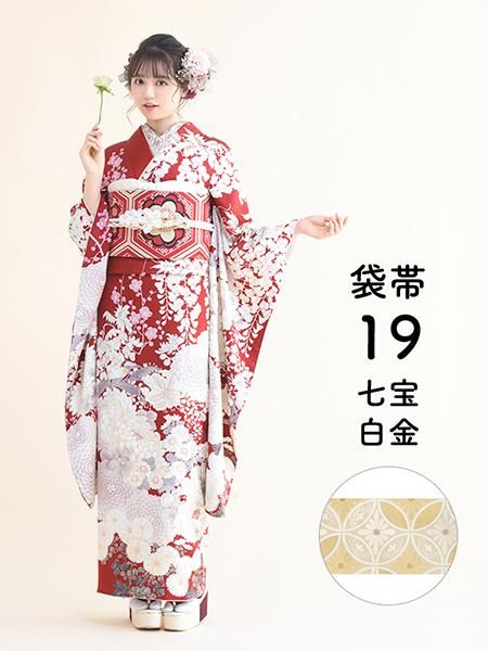 正絹振袖レンタルセット 緋色の祝い(赤)/帯 七宝(白金)