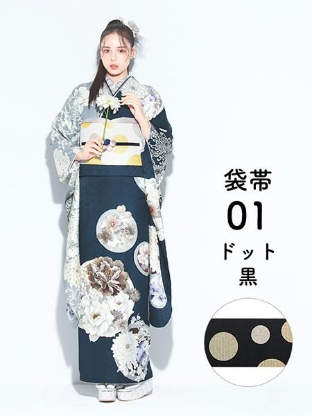 振袖レンタルセット つばき刺繍(グレー)/帯 亀甲(オフ)