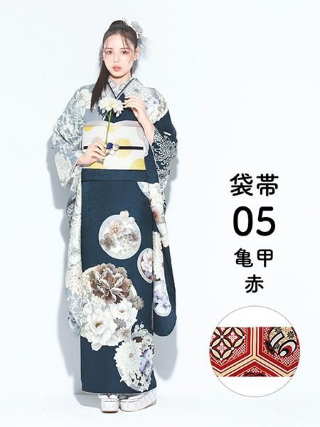 正絹振袖レンタルセット 花丸紋と菊(片身替り/紺)/帯 亀甲(赤)
