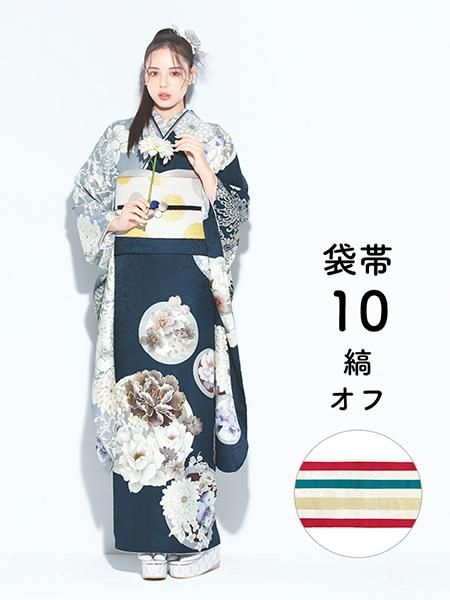 正絹振袖レンタルセット 花影(シャンパンゴールド)/帯 縞(黒)