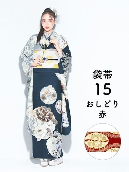 正絹振袖レンタルセット 花丸紋と菊(片身替り/紺)/帯 おしどり(赤)