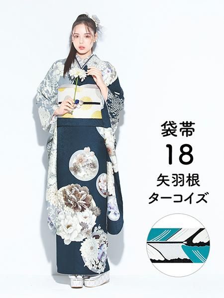 振袖レンタルセット アネモネブーケ(黒)/帯 花菱亀甲(白金)