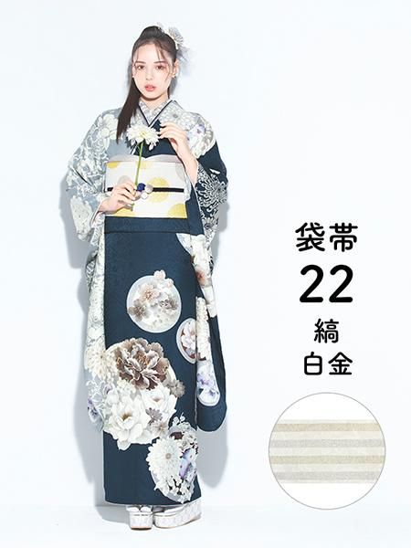 正絹振袖レンタルセット 花丸紋と菊(片身替り/紺)/帯 縞(白金)