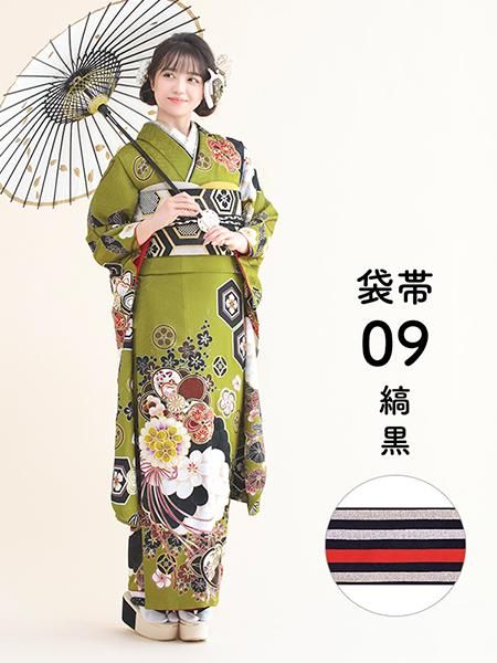 振袖レンタルセット フラッグ菊(黒)/帯 縞(オフ)