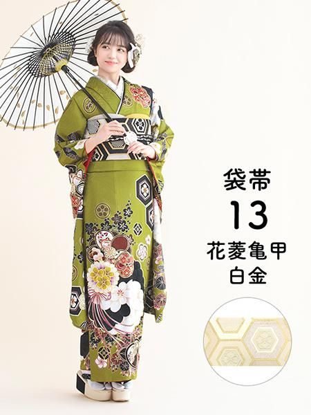 正絹振袖レンタルセット 音楽(エメラルドグリーン)/帯 縞(白金)
