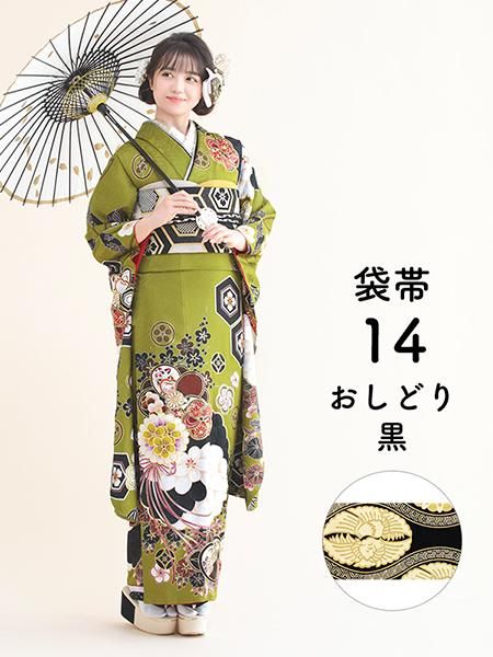 振袖レンタルセット 花きりばみ(黒)/帯 花菱亀甲(緑)